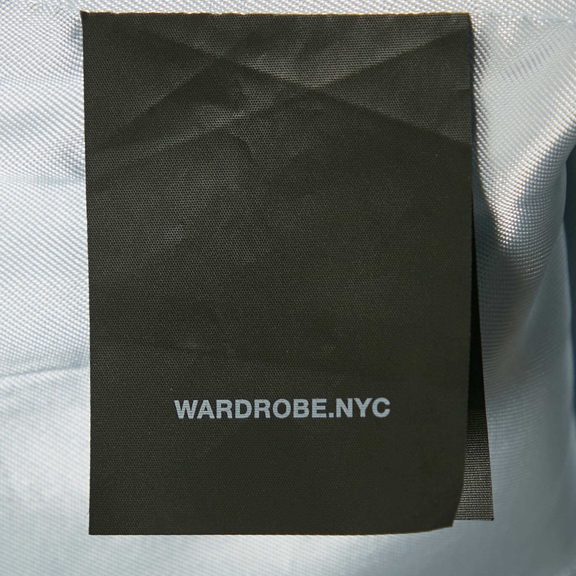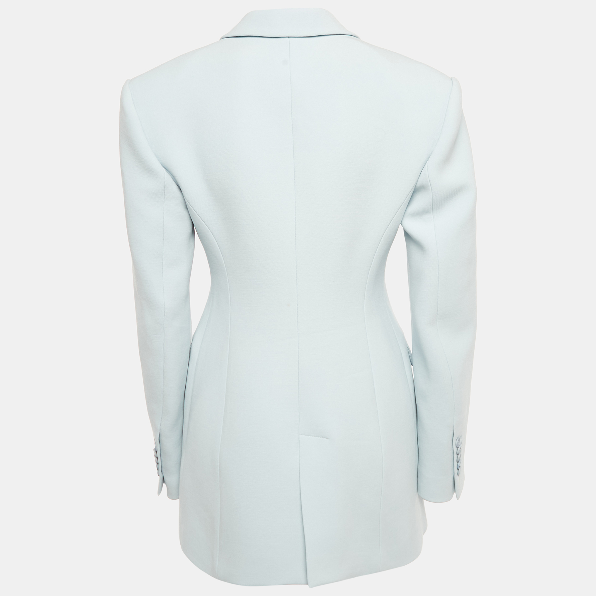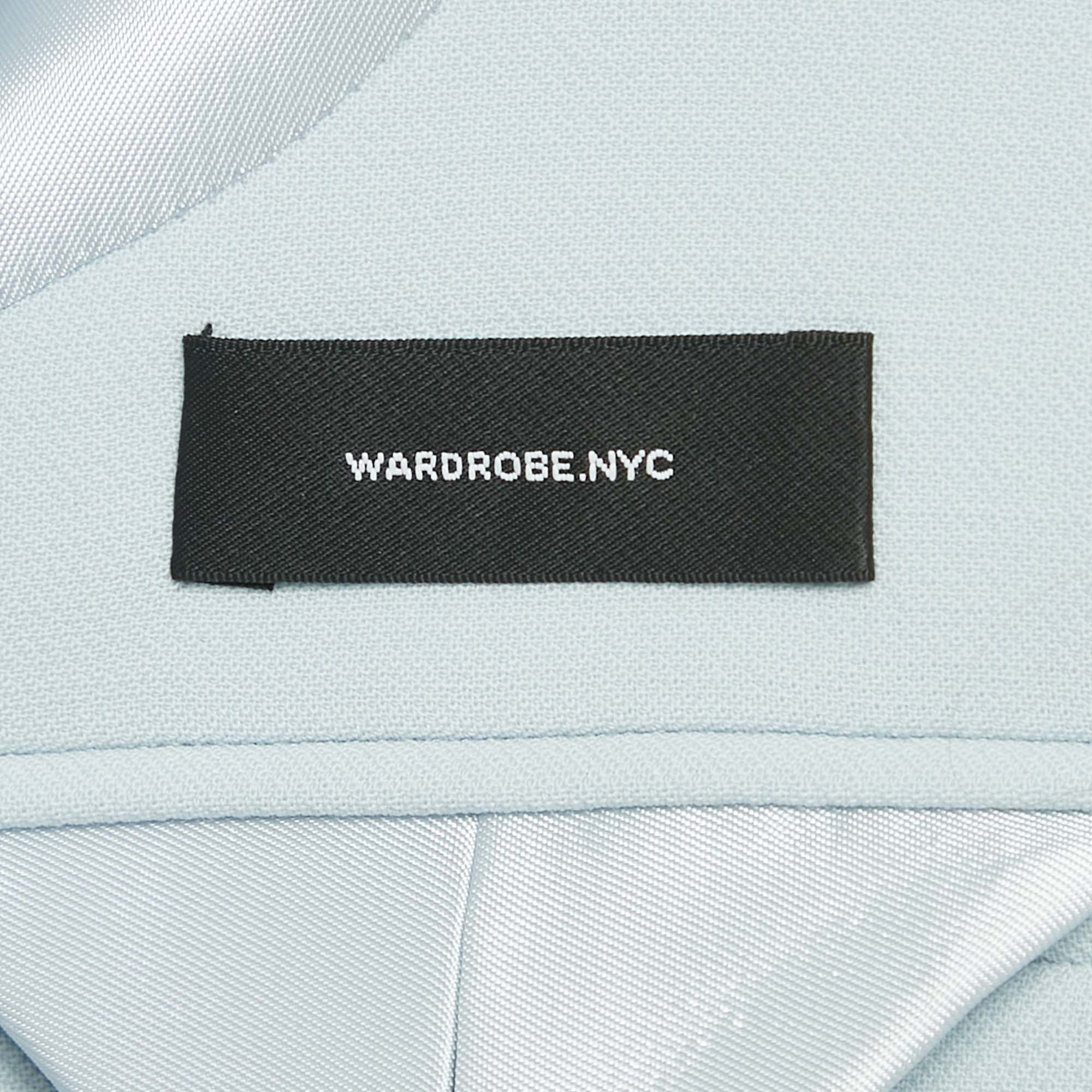 Wardrobe NYC offers a modern uniform with this blue wool crepe blazer. The button front closure and clean lines embody quiet sophistication. It’s a perfect anchor piece for sharp trousers or layered over a slip dress.